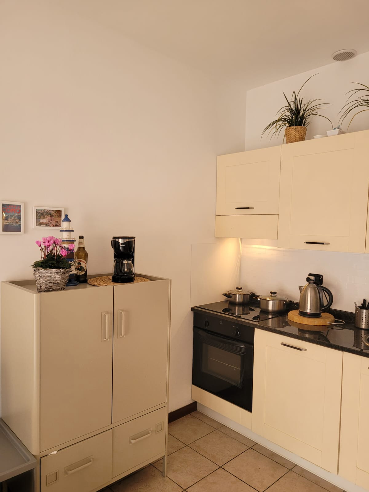 Die offene Induktionsküche ist mit Kühlschrank/Gefrierschrank, Backofen, Geschirr/Besteck, Küchenutensilien, Kaffeemaschine und Wasserkocher ausgestattet.