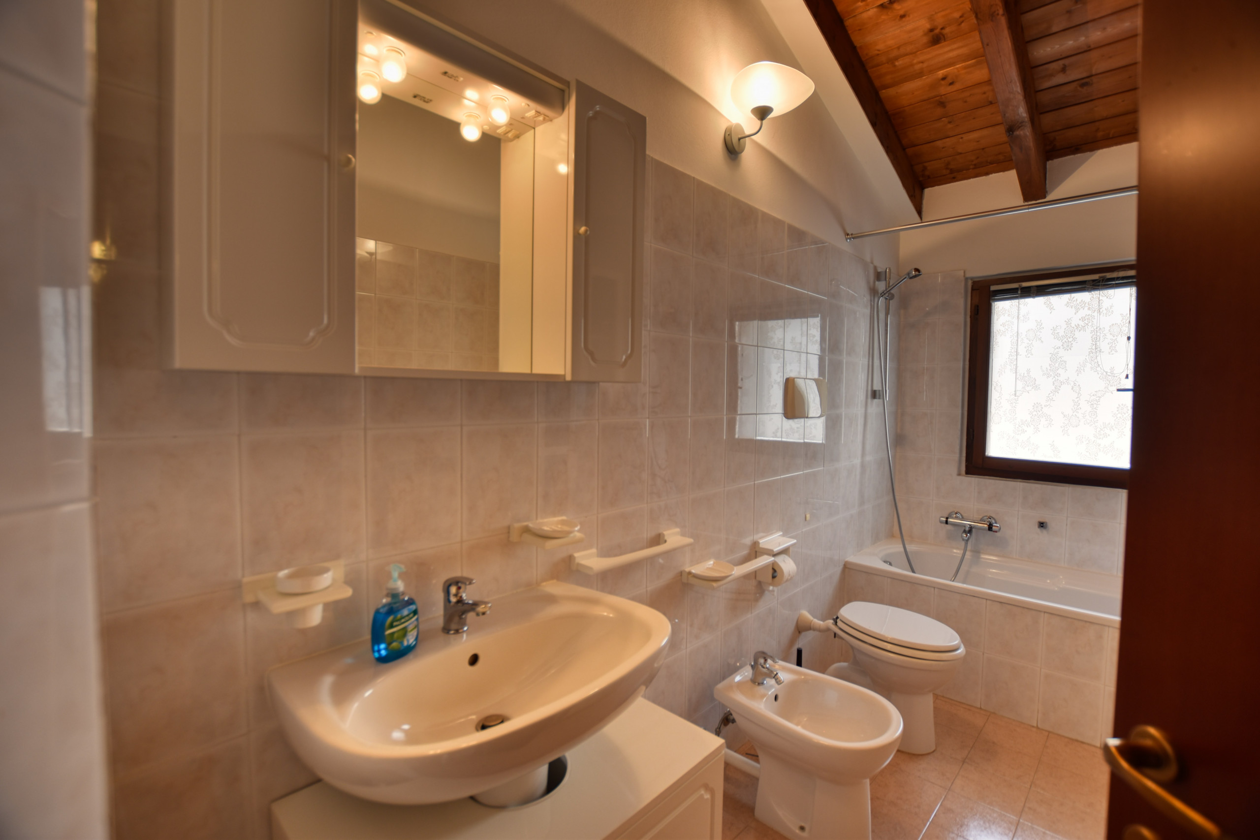 The second floor is accessed via a narrow spiral staircase and comes with two fully airconditioned bedrooms for 4 persons. The main bedroom features a double bed, wardrobe and a small balcony with lake view. The second bedroom has two single beds and a wardrobe. The bathroom upstairs has a bath with shower, sink, hair dryer and toilet. The apartment is equipped with a private Wi-Fi connection and comes with a private parking space.
