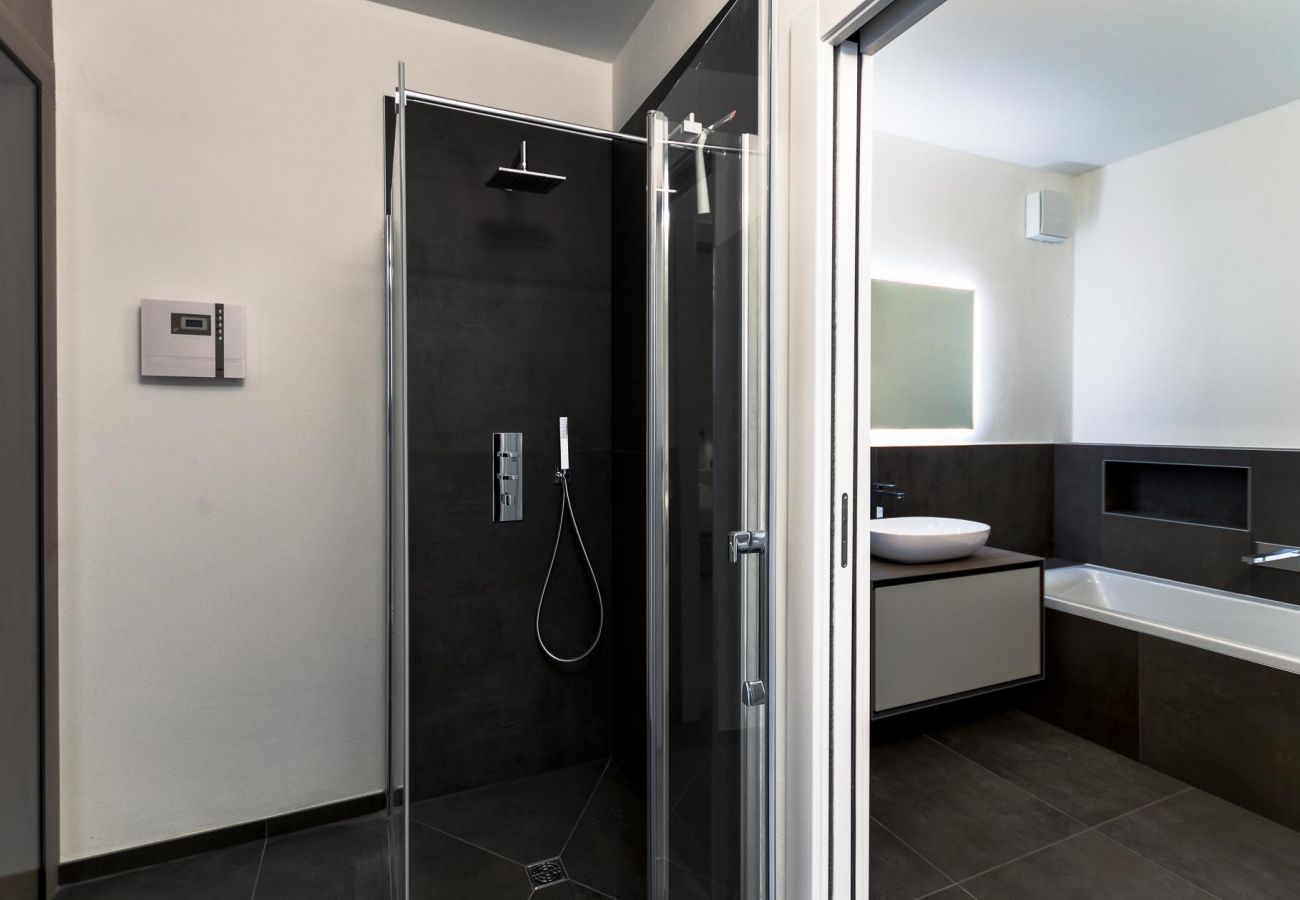The shared swimming pool with stunning lake and mountain views can be accessed from a private path, exclusively used by the property and common entrance. The approximate dimensions of the swimming pool are 12x5x1.3m deep. The unheated swimming pool is open from April 15 through September 30 and provides ample space for the provided sun beds and comes with an outdoor shower. The living room is shared with the open high-end fully fitted kitchen and a marvellous all-glass long dining table for up to 6 persons. The kitchen comes with a refrigerator, induction cooking hob with innovative invert suction hood, microwave, dishwasher and all the necessary kitchen utensils.