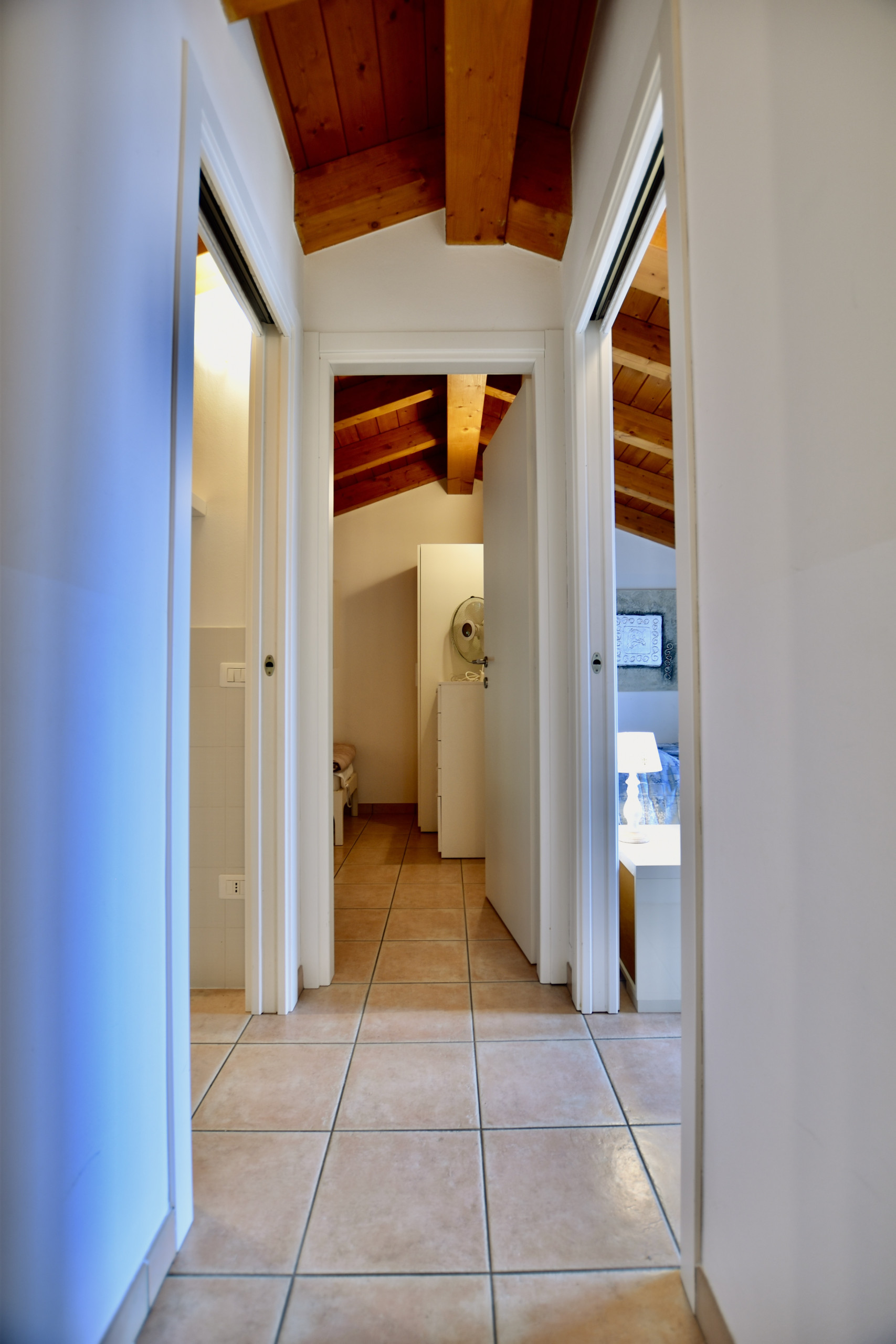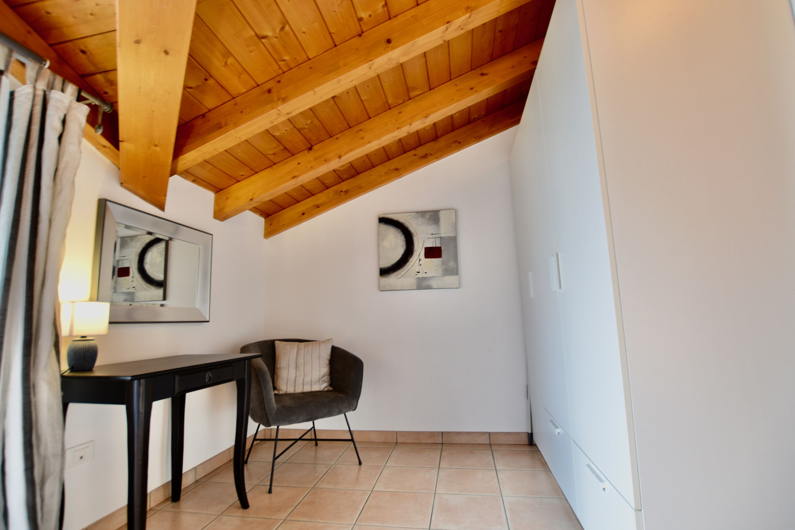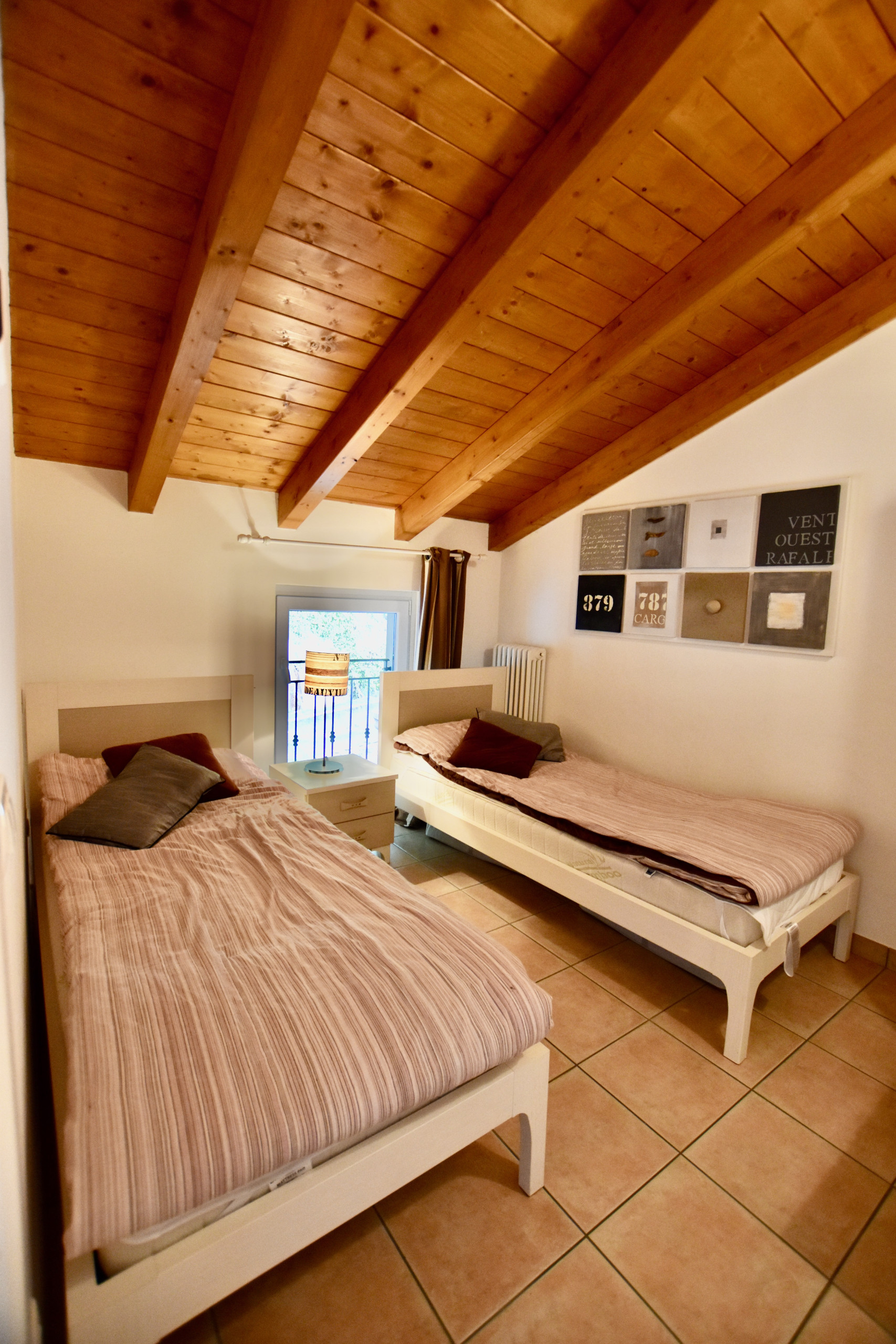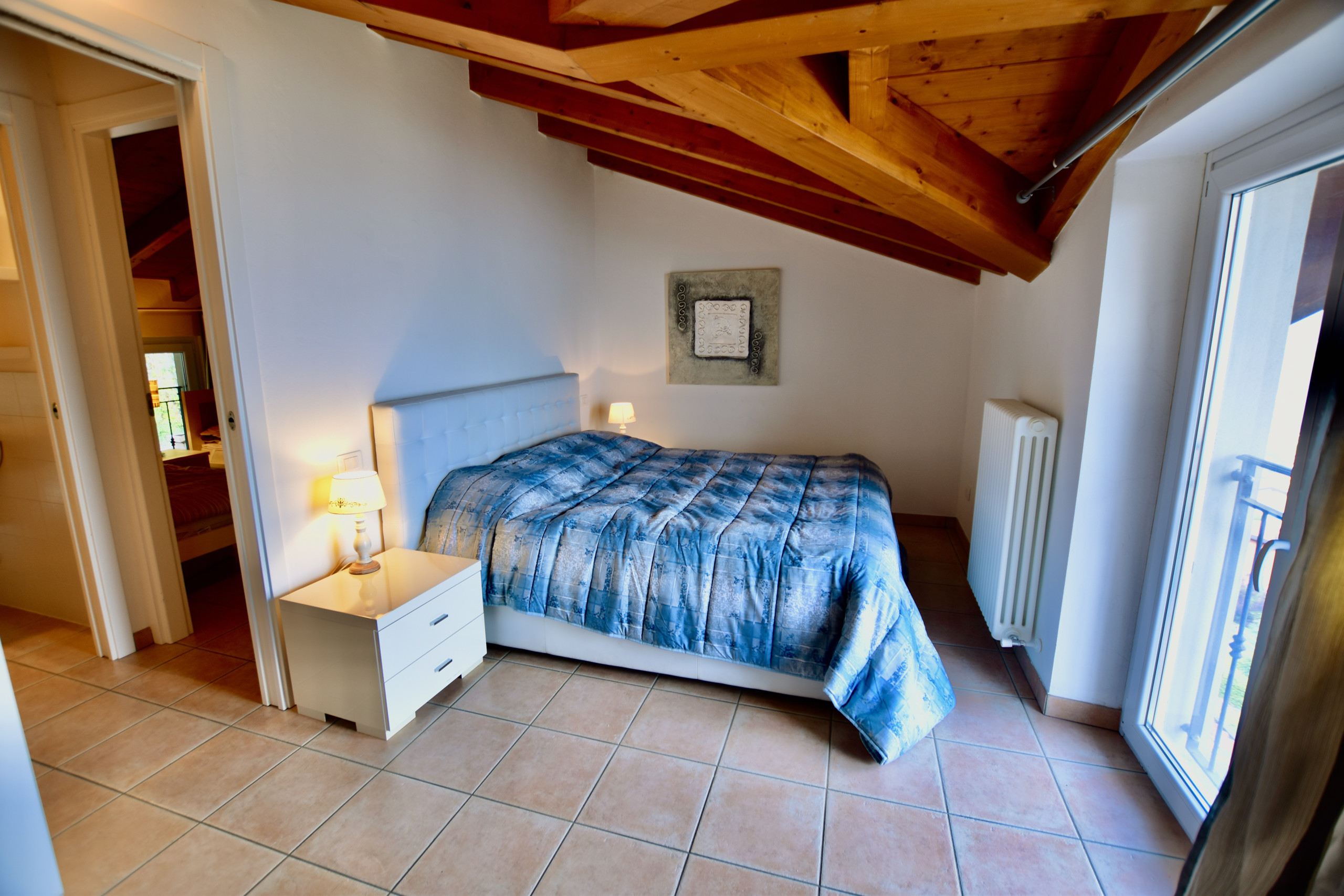 The accommodation is ideal for small groups and families up to 4 adults. On the upper floor there are two bedrooms: the master bedroom with a double bed, desk and wardrobe and a second bedroom with two single beds and a wardrobe.
