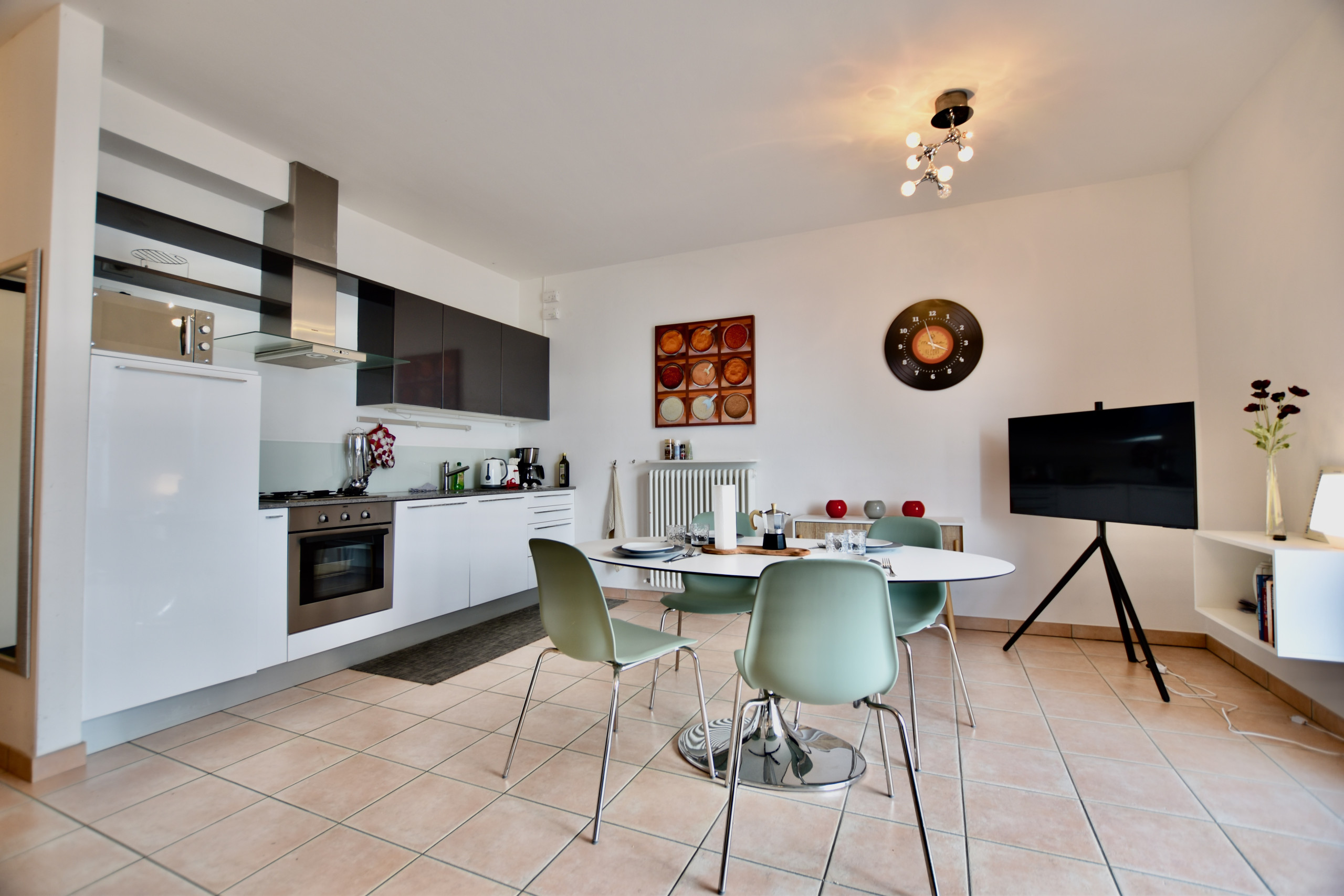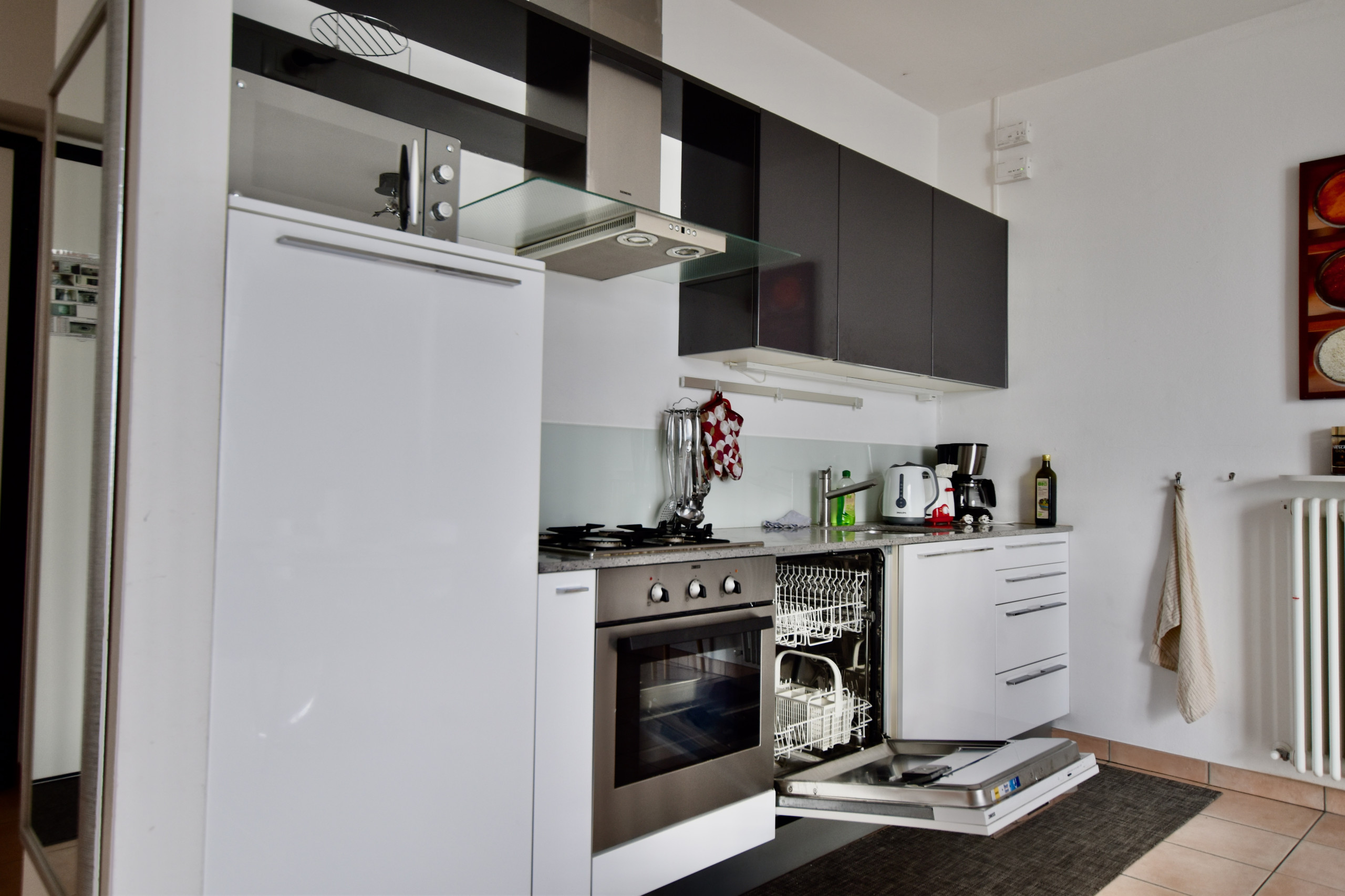 Living room with open kitchen: The apartment has a furnished spacious living room with extendable dining table, couch, cocktail armchair and internet-enabled flat-screen TV. A sliding door leads to the balcony with a wonderful lake view. The open kitchen is fully equipped and has a gas stove, an oven, a dishwasher and a refrigerator. Furthermore, the usual kitchen utensils such as a coffee machine, espresso machine, milk frother, kettle, toaster, etc. are available.