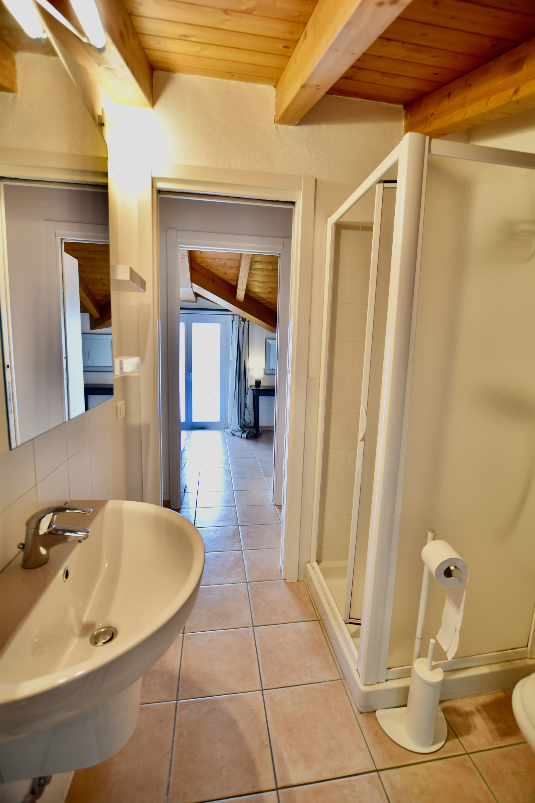 From the king-size bed in the master bedroom you have a very nice view of the lake. There is a large closet with an iron, ironing board and clothes horse, a small work table and a wicker armchair. The adjoining new bathroom has a shower, toilet, washbasin, washing machine, hairdryer, bathroom scales and make-up mirror.