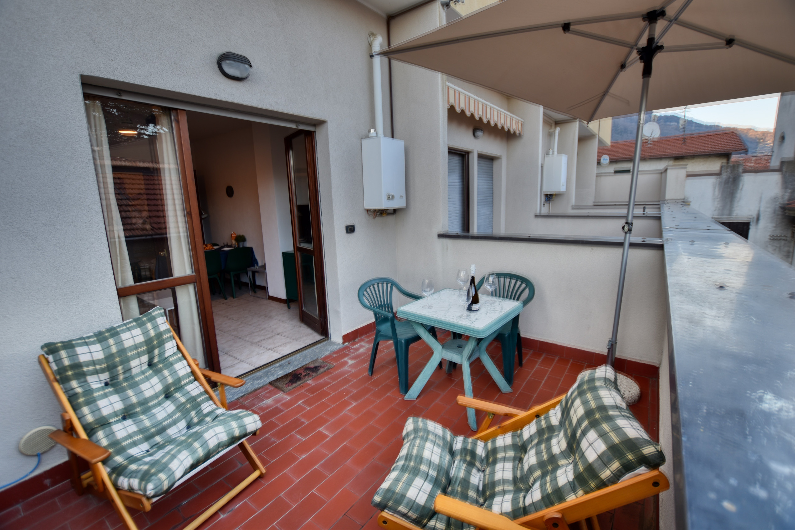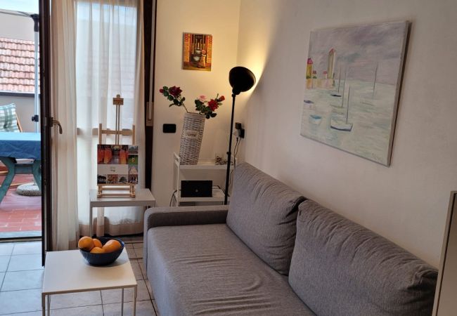 Colorful studio apartment with vintage elements for 2 people in the authentic town of Acquaseria. With balcony and a partial Lake view on both sides and just 1 minute walk from the local beach. Includes a covered parking space near the building.